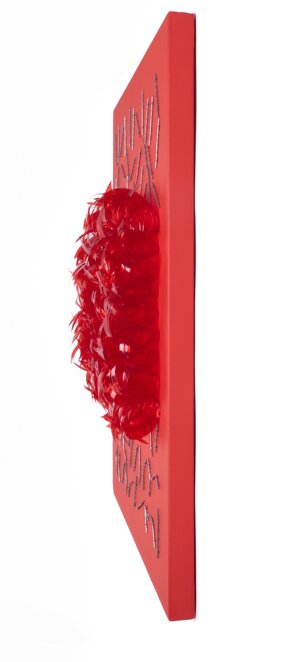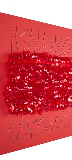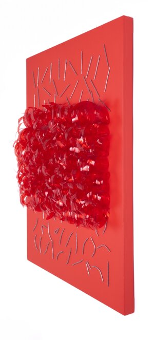Marzo 2024Installazione di plastica riciclata e metallo su tela. Tecnica mista.